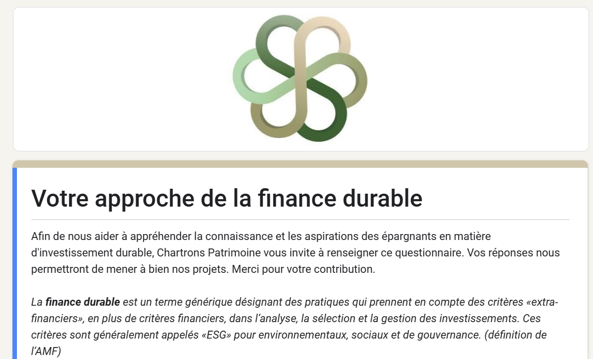 3 petites minutes pour la finance durable… Répondez à notre enquête pour nous aider à appréhender la connaissance et les aspirations des épargnants en matière d’investissement responsable. Vos réponses nous permettront de mener à bien nos projets. Merci pour votre contribution.